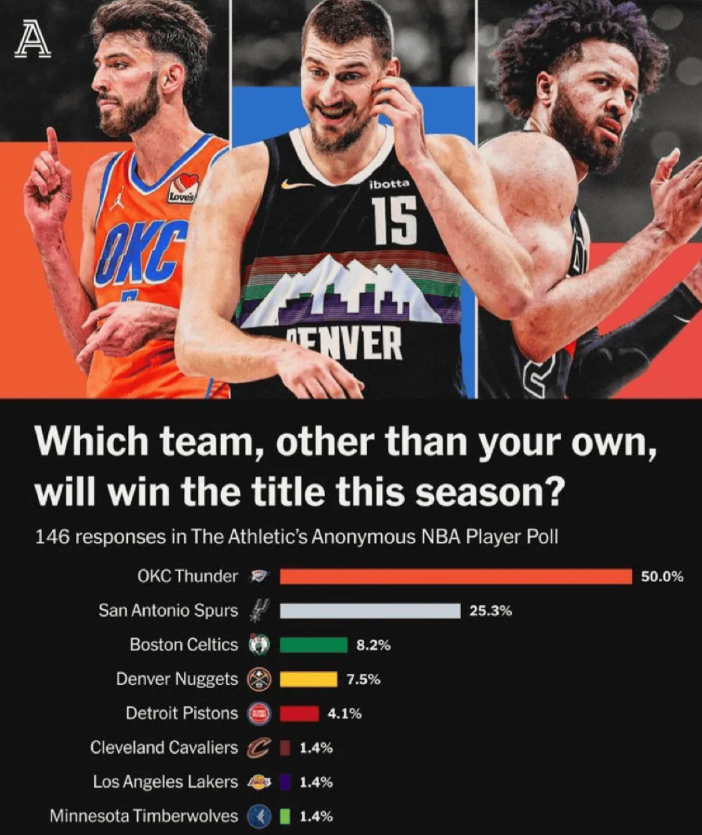 4月13日,NBA常规赛落幕,美国知名媒体《The Athletic》发布一项球员匿名调查,问题为:“除了自己球队,你认为哪支球队能夺冠?”,结果在146份调查中,雷霆被50%的球员认为能夺冠,远远领先第二名马刺的25.3%。